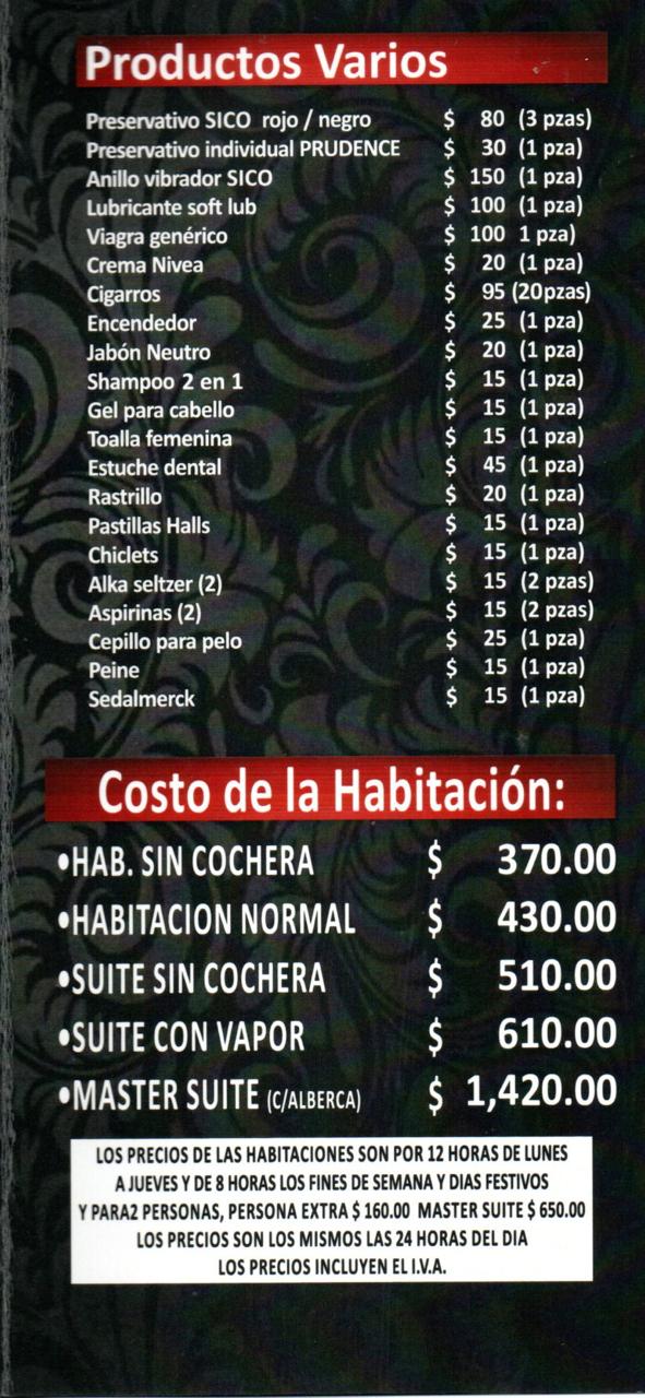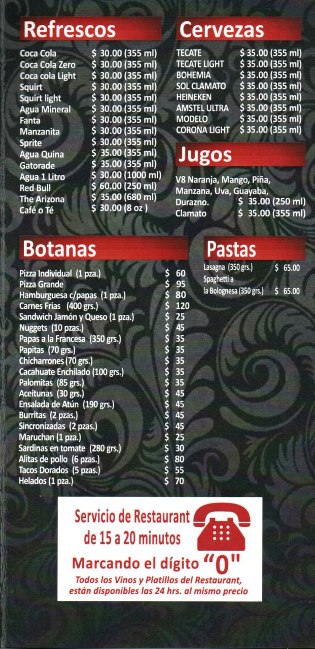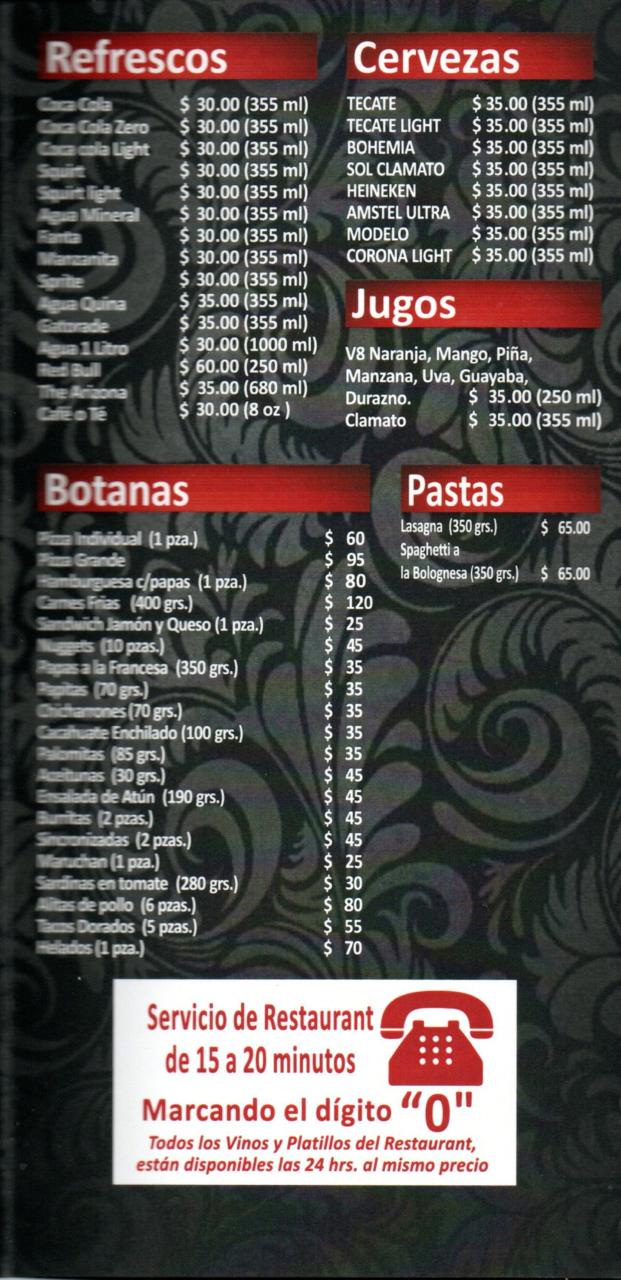 Servicio de Restaurante & Bar con precios fijos las 24 hrs todos los días del año. Con un amplio surtido en vinos, licores y cervezas. Ricas comidas y botanas. Consulte nuestro Menú que se encuentra en su habitación